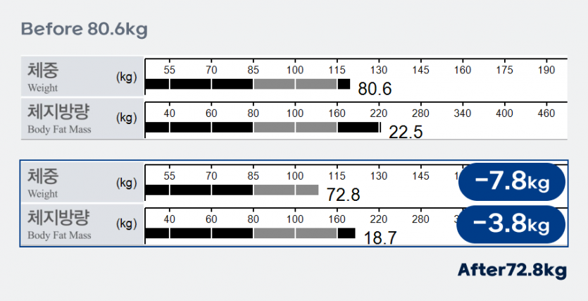 80kg대였던 체중이 72.8kg로 내려가면서 몸도 마음도 한결 가벼워졌어요.