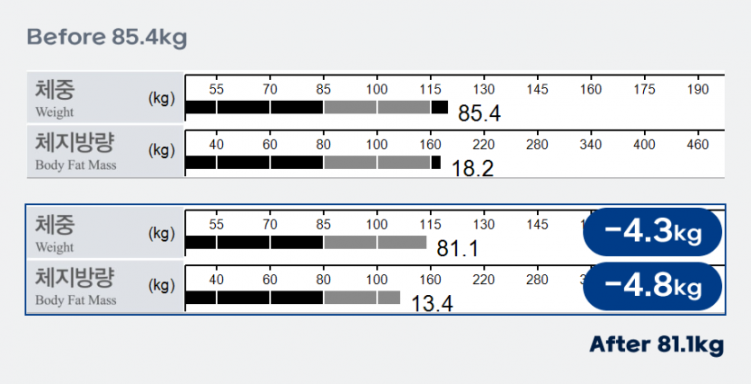 한 달 만에 4.3kg 감량, 체지방은 무려 4.8kg이나 줄었어요.