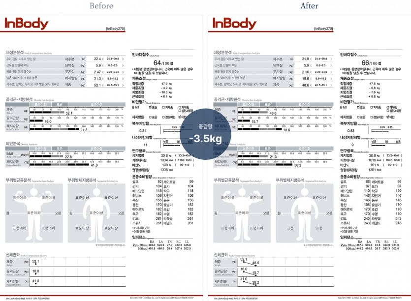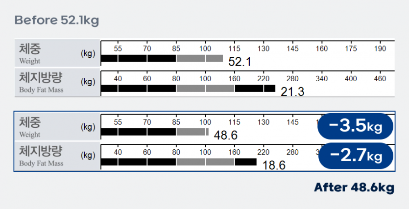영롱 다이어트 프로그램으로 1개월 만에 3.5kg 감량하고 체지방도 2.7kg 줄었어요.